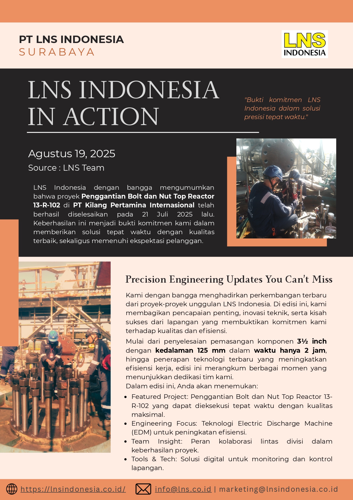Dengan pengalaman ini, PT LNS Indonesia siap mendukung kebutuhan pemeliharaan dan perbaikan peralatan kilang Bapak/Ibu.